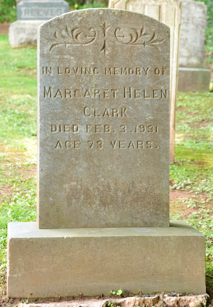 | Burial | She was buried in the Peoples Cemetery, Freetown, Prince County, Prince Edward Island, Canada, 46.37348, -63.62347G. Inscription: In Loving memory of / Margaret Helen / Clark / Died Feb. 3, 1931 / Age 73 Years.5 Tombstone, Margaret Helen Clark (1857-1931). United Church Cemetery, Freetown, Prince County, Prince Edward Island, Canada.  Front inscription detail. |