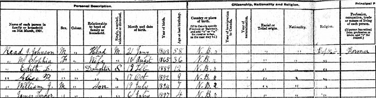 | Witness | He was enumerated on the census Between 10 April 1901 and 12 April 1901 in the household of James Johnson Read in Jolicure, Westmorland County, New Brunswick, CanadaG. included in the household with Johnson (age 58) were his second wife Sophia Oulton (age 36), and their children Edith (age 12), Alice (age 9), William (age 7) and James Turner (age 4). Johnson was a farmer. The family religion was Baptist. Johnson Read's farm was adjacent to that of Frank Townshend.1 1901 Canada Census, Jolicure, Westmorland County, New Brunswick. Household of James Johnson Read, his second wife Sophia Oulton, and their children Edith, Alice, William and James Turner. |