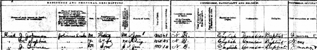 | Witness | He was enumerated on the census Between 10 April 1901 and 12 April 1901 in the household of James Johnson Read in Jolicure, Westmorland County, New Brunswick, CanadaG. included in the household with Johnson (age 58) were his second wife Sophia Oulton (age 36), and their children Edith (age 12), Alice (age 9), William (age 7) and James Turner (age 4). Johnson was a farmer. The family religion was Baptist. Johnson Read's farm was adjacent to that of Frank Townshend.4 1901 Canada Census, Jolicure, Westmorland County, New Brunswick. Household of James Johnson Read, his second wife Sophia Oulton, and their children Edith, Alice, William and James Turner. |