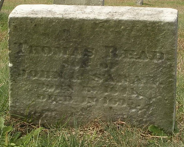Inscription: Thomas Read / Son of / John & Sarah / Born in 1641 / Died in 1695.2  Tombstone, Thomas Read (1641-1695). Newman Cemetery, Providence, Rhode Island. Photo contributed by Jen Snoots to findagrave.com.