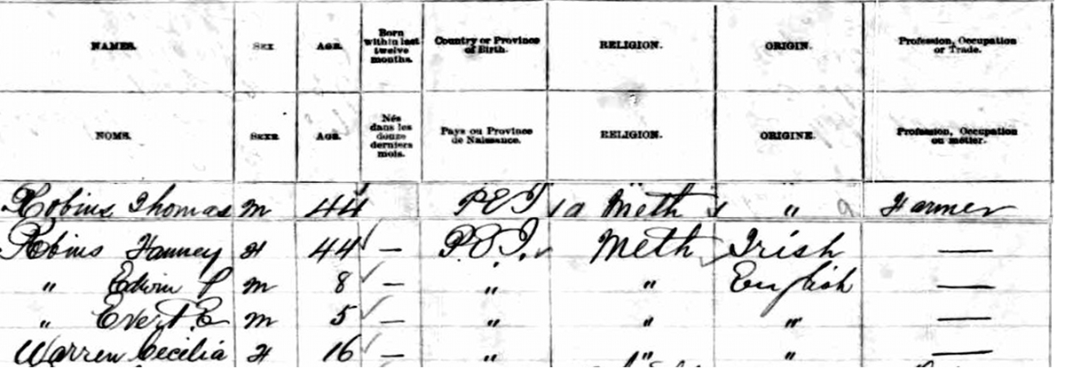 | Witness | He was enumerated on the census in 1881 in the household of Thomas Robins in Lot 26, Prince County, Prince Edward Island, CanadaG. Thomas (age 44) was listed as a farmer and Baptist. Within the household were his wife Fanney (age 44), sons Edwin P. (age 8) and Everett (Evert) E. (age 5). Also in the household was Cecilia Warren (age 16), probably a domestic.1 1881 Canada Census, Lot 26, Prince County, Prince Edward Island. Household of Thomas Robins, his wife Frances Boyle, children Edwin & Evert. |