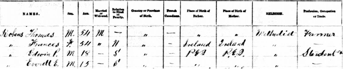 | Witness | Edwin Proctor Robins was enumerated on the census in 1891 in the household of Thomas Robins in Lot 26, Prince County, Prince Edward Island, CanadaG. Thomas (age 54) was head of household, with his wife Frances (age 54), Edwin P. (age 18) and Everett E. (age 13). Thomas was listed as a farmer and a Methodist. Frances was listed as Methodist, born on Prince Edward Island. Her father was born in Ireland while her mother was born on PEI. They lived on the farm adjacent to that of Joseph Bradshaw and Mary Read.3 1891 Canada Census, Lot 26, Prince County, Prince Edward Island. Household of Thomas Robins, his wife Frances 'Fanny' Boyle, their children Edwin and Everett. |