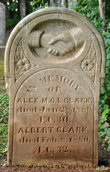 | Burial | He was buried in the Peoples Cemetery, Freetown, Prince County, Prince Edward Island, Canada, 46.37355, -63.62335G. Inscription: In memory / of / Alex. M.C.L. Clark / died Jan. 2, 1880 / AEt. 30 / Albert Clark / died Feb. 8, 1880 / AEt. 32.2 Tombstone, Alexander McLeod Clark (1850-1880), his brother Albert (1848-1880). United Church Cemetery, Freetown, Prince County, Prince Edward Island, Canada. |