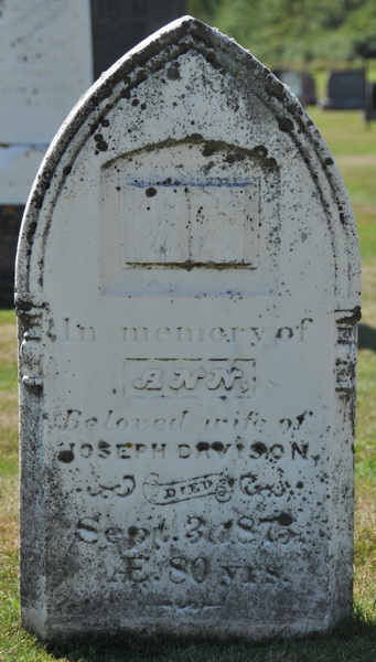 | Burial | She was buried in North Bedeque Cemetery, North Bedeque, Prince County, Prince Edward Island, Canada, 46.36164, -63.72626G. square sandstone obelisk. Inscription: In memory of / William Craig / died / June 15, 1860 / AEt. 47 / Also / his wife / Jane Hooper / died / Sept. 9, 1889 / AEt. 75. Left: Ann Elizabeth / died / March 28, 1866 / AEt. 19 / Sarah / died / July 10, 1886 / AEt. 35. Right: William Artemas / died / April 22 , 1860 / AEt. 4 . There are small adjacent stones, Ann Elizabeth, William Artemas.3,1 Tombstone, William Craig (1813-1860), his wife Jane Hooper (1814-1889), their children Ann Elizabeth (1847-1866), Sarah (1851-1886), William Artemas (c1856-1860). North Bedeque Cemetery, North Bedeque, Prince County, Prince Edward Island.  Front inscription detail.  Left inscription detail.  Right inscription detail. |