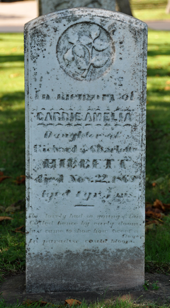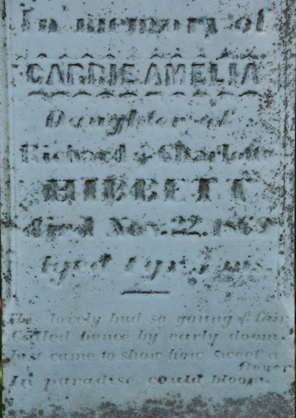 Stone to the right of her parents. Inscription: In memory of / Carrie Amelia / Daughter of / Richard & Charlotte / Hibbett / Died Nov. 22, 1869 / Aged 1 yr 3 mts. / -- / This lovely bud so young & fair / Called hence by early doom / Just came to show how sweet a flower / In paradise could bloom.1  Tombstone, Carrie Amelia Hibbett (1868-1869). St. John's Anglican Church Cemetery, St. Eleanors, Prince County, Prince Edward Island, Canada.  Front inscription detail.