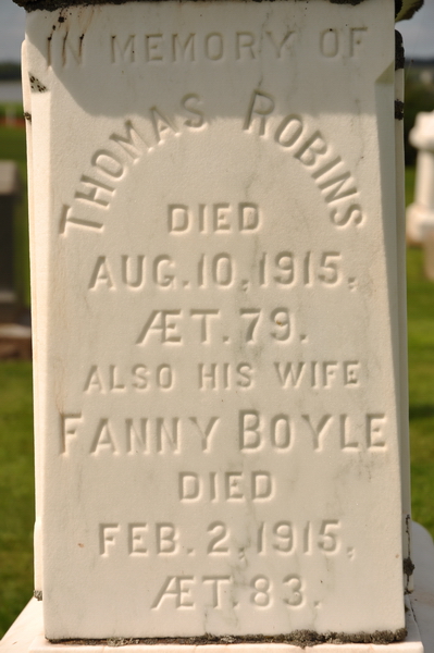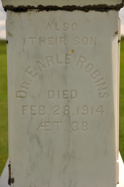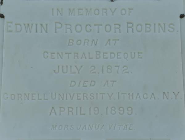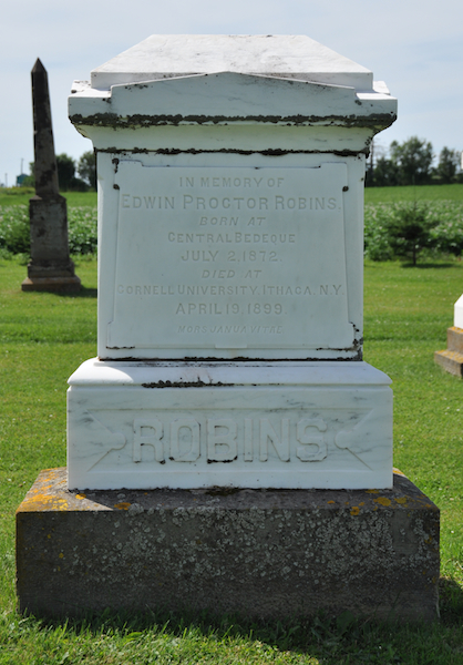 | Burial | He was buried in United Church (Bedeque) Cemetery, Lower Bedeque, Prince County, Prince Edward Island, Canada, 46.34699, -63.73409G. Bedeque Cemetery is located along the road midway between Bedeque and Lower Bedeque. Inscription: In Memory Of / Edwin Proctor Robins, / Born At / Central Bedeque / July 2, 1872. / Died at / Cornell University, Ithaca, N. Y. / April 19 1899. / Mors Janua Vitae [Death is the gate of [everlasting] life].Left: In Memory Of / Thomas Robins / Died / August 10, 1915. / ÆT. 79. / Also His Wife / Fanny Boyle / Died / Feb. 2, 1915, / ÆT. 83.Right: Also / Their Son / Dr. Earle Robins / Died / Feb. 28, 1914, / ÆT. 38.2 Left inscription detail.  Right inscription detail.  Tombstone for Edwin Proctor Robins (1872-1899), his parents Thomas Robins (1836-1915) and Fanny Boyle (1836-1915), and his brother Earle Robins (1878-1914). United Church Cemetery (Bedeque Cemetery), Lower Bedeque, Prince Edward Island, Canada.  Front inscription detail. |