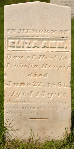 white marble ballast stone. Inscription:In memory of / Eliza Ann / Dau. of Alexr. A & / Isabella Hooper / Died / June 22, 1861, / Aged 13 yrs. / Remember now thy / Creator / in the days of / thy youth.1  Tombstone, Eliza Ann Hooper (c1848-1861)North Bedeque Cemetery, Prince County, Prince Edward Island, Canada.