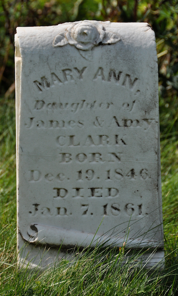 | Burial | She was buried in North Bedeque Cemetery, North Bedeque, Prince County, Prince Edward Island, Canada, 46.36170, -63.72629G. Inscription: Mary Ann / Daughter of / James & Amy / Clark / Born Dec. 19, 1846 / Died / Jan. 7, 1861.2 Tombstone, Mary Ann Clark (1846-1861). North Bedeque Cemetery, North Bedeque, Prince County, Prince Edward Island. |