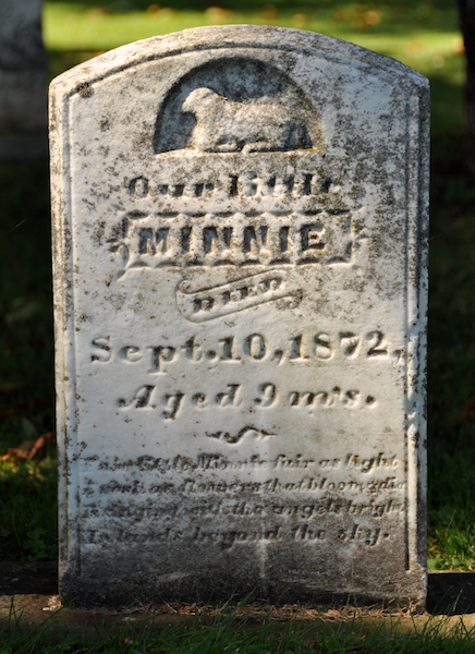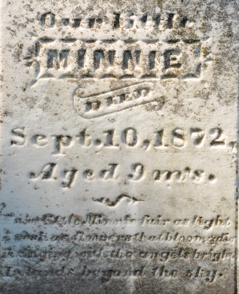 Stone to the right of sister Carrie. Inscription: Our little / Minnie / Sept. 10, 1872. / Aged 9 mt's / Fair little Minnie, fair as light, fresh as flowers that bloom and die, is singing with the angels bright, in lands beyond the sky.1  Tombstone, Minnie Hibbett (1871-1872). St. John's Anglican Church Cemetery, St. Eleanors, Prince County, Prince Edward Island, Canada.  Front inscription detail.