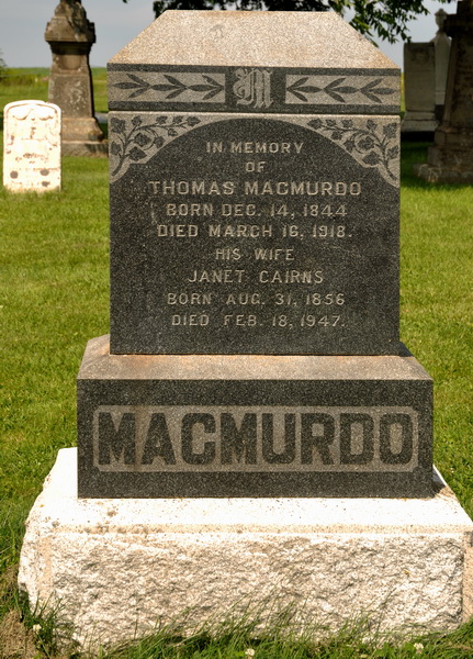 - [S3706] Cemetery Marker - Thomas MacMurdo (1844-1918) & Janet Cairns (1856-1947). Thomas MacMurdo (1844-1918), Cemetery Marker; David Arthur Walker, 31 July 2009.
