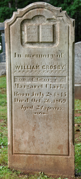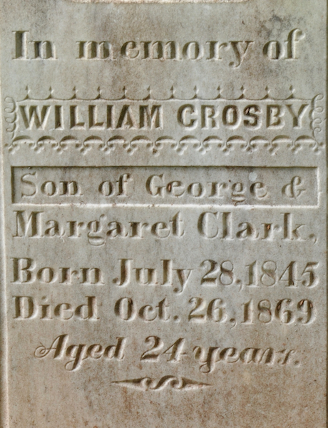 | Burial | He was buried in the Peoples Cemetery, Freetown, Prince County, Prince Edward Island, Canada, 46.37354, -63.62336G. Inscription: In the / midst / of life | we are / in / death / In Memory of / William Crosby / Son of George & / Margaret Clark / Born July 28, 1845 / Died Oct. 26, 1869 / Aged 24 Years. [J. Phillips, stonecutter].1 Tombstone, William Crosby Clark (1845-1869). United Church Cemetery, Freetown, Prince County, Prince Edward Island, Canada.  Front inscription detail. |