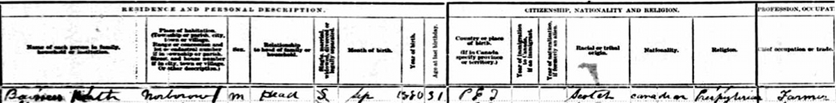 | Son | He was enumerated on the census in 1881 in the household of Charles Crossman, as a son, in Lot 28, Prince County, Prince Edward Island, CanadaG. Enumerated in the household of Charles Crossman (age 50) were his wife, Jane Walker (age 60), his son John (age 25) from a previous marriage, and their daughter Eliza (age 16). Charles and John were farmers. The family religion was Baptist, except for Jane who was Presbyterian.2 |