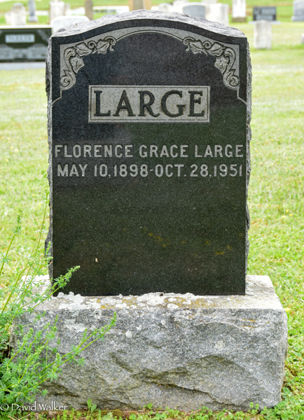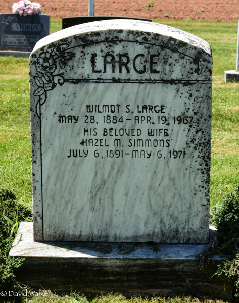 Inscription: LARGE / Wilmot S. Large / May 28, 1884 - Apr. 19, 1967 / His Beloved Wife / Hazel M. Simmons / July 6, 1891 - May 6, 1971.2  Tombstone, Wilmot S. Large (1884-1967), his wife Hazel M. Simmons (1891-1971). Westmoreland Baptist Cemetery, Queens County, Prince Edward Island, Canada.