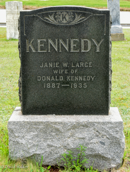Inscription: KENNEDY / Janie W. Large / Wife of / Donald Kennedy / 1887 - 1935.1  Tombstone, Janie W. Large (1887-1935). United Church Cemetery,Tryon, Prince County, Prince Edward Island, Canada.
