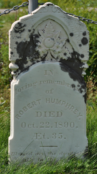 Inscription: In / loving remembrance / of / Robert Humphrey / Died / Oct. 22, 1890 / AEt. 35. / Blessed are the dead who / die in the Lord.3,4  Tombstone, Robert Humphrey (c1855-1890). North Bedeque Cemetery, North Bedeque, Prince County, Prince Edward Island.