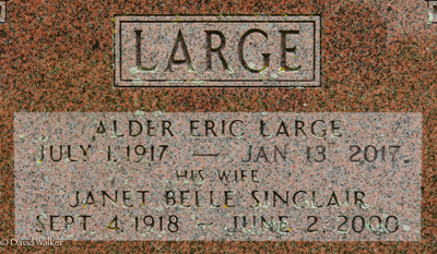 Inscription: LARGE / Reuben Robblee Large / 1889 - 1970 / His Wife / Ada Isabel Moase / 1894 - 1959Back: LARGE / Alder Eric Large / July 1, 1917 - Jan. 13, 2017 / His Wife / Janet Belle Sinclair / Sept. 4, 1918 - June 2, 2000.8  Tombstone, Reuben Robblee Large (1889-1970), his wife Ada Isabel Moase (1894-1959), their son Alder Eric Large (1917-2017), his wife Janet Belle Sinclair (1918-2000). Peoples Cemetery, Summerside, Prince County, Prince Edward Island, Canada.  Back inscription detail.