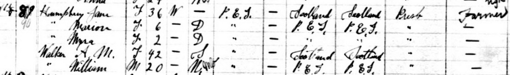 | Daughter | She was enumerated on the census on 17 April 1891 in the household of Jane Walker, as a daughter, in Lot 25, Prince County, Prince Edward Island, CanadaG. Jane was listed as head of household #90, a widow, with her daughters Marion and Myra. Also listed were A.M. Walker as a 42 year old sister (probably Ann) and William Walker, aged 20, listed as nephew (son of William Weir Walker and Ellen Walker). All members in the household were Presbyterian. Jane's occupation was listed as farmer. They lived in the household adjacent to the family of Jane's 1st cousin, David Walker and Elizabeth Higgins.4 1891 Canada Census, Lot 25, Prince County, Prince Edward Island, household of Jane (Walker) Humphrey. Jane was listed as head of household #90, a widow, with her daughters Marion and Myra. Also listed were A.M. Walker as a 42 year old sister (probably Ann) and William Walker, aged 20, listed as nephew. All members in the household were Presbyterian. Jane's occupation was listed as farmer. |