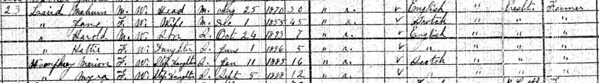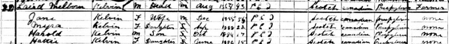 | Daughter | She was enumerated on the census on 16 April 1901 in the household of John Melbourne Laird, as a daughter, in Lot 25, Prince County, Prince Edward Island, CanadaG. Enumerated with John were his wife Jane (Walker), son Harold, daughter Hattie, and stepchildren (Jane and her first husband, Robert Humphrey) Marion and Myra. The family religion was Presbyterian. Melbourne was a farmer.1 1901 Canada Census, Lot 25, Prince Edward Island, household of Melbourne Laird. Also listed in this household #23 were his wife Jane (Walker), son Harold, daughter Hattie, and stepchildren (Jane and her first husband, Robert Humphrey) Marion and Myra. The family religion was Presbyterian. Melbourne was a farmer. |