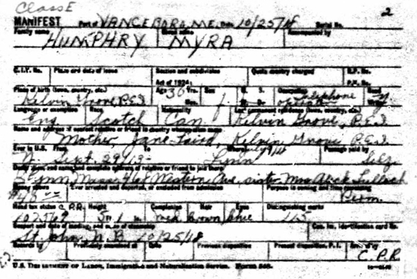 | Border Crossing | She crossed the border on 25 October 1918 at in Vanceboro, Washington County, Maine, USAG. Recorded on the border crossing card was her mother, Jane Laird, as the departure contact, and her sister, Mrs. Alex Tulloch as her arrival contact.3 Border Crossing card Canada to U.S., Myra Humphrey, 25 October 1918. |