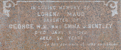 | Burial | She was buried in the Peoples Cemetery, Kensington, Prince County, Prince Edward Island, Canada, 46.44759, -63.62851G. Inscription: In Loving Memory of / George W. W. Bentley / Born December 21, 1842 / Died April 8, 1909 / And of his wife, / Emma J. Dennis, / Born February 15, 1849 / Died May 12, 1910Back: In Loving Memory of / Lorena Maud / daughter of / George W. E. & Emma J. Bentley / Died Jany. 8, 1902 / Aged 24 years / "In her presence it was sunshine."2 Tombstone, George W. W. Bentley (1842-1909), his wife Emma J. Dennis (1849-1910), their daughter Lorena Maud Bentley (1878-1902). Peoples Cemetery, Kensington, Prince County, Prince Edward Island, Canada.  Front detail.  Back detail. |