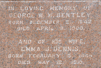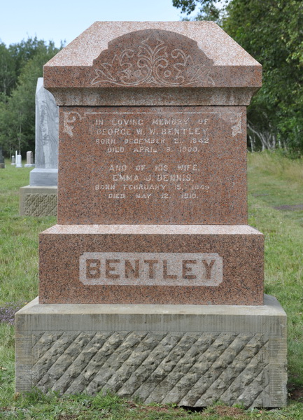 | Burial | He was buried in the Peoples Cemetery, Kensington, Prince County, Prince Edward Island, Canada, 46.44759, -63.62851G. Inscription: In Loving Memory of / George W. W. Bentley / Born December 21, 1842 / Died April 8, 1909 / And of his wife, / Emma J. Dennis, / Born February 15, 1849 / Died May 12, 1910Back: In Loving Memory of / Lorena Maud / daughter of / George W. E. & Emma J. Bentley / Died Jany. 8, 1902 / Aged 24 years / "In her presence it was sunshine."2 Tombstone, George W. W. Bentley (1842-1909), his wife Emma J. Dennis (1849-1910), their daughter Lorena Maud Bentley (1878-1902). Peoples Cemetery, Kensington, Prince County, Prince Edward Island, Canada.  Front detail.  Back detail. |