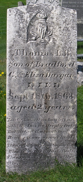 | Burial | He was buried in Hampstead Baptist Cemetery, Queens County, New Brunswick, Canada, 45.641398, -66.114283G. Inscription: Thomas L.B. / Son of Bradford / G. & Eliza Durgan, / DIED / Sept. 18th, 1863, / aged 2 years. / Lovely baby thou hast left us / Ah! the loss we deeply feel /But tis God that hath bereft us. / He can all our sorrows heal. / Then again we hope to meet there. / When the dream of life is fled. / Then again we hope to greet thee / Where no more parting tears / are shed. Footstone - T.L.B.D.1 Tombstone - Thomas L.B. Durgan (ca. 1861-1863), son of Bradford and Eliza Durgan. |