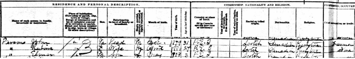 | Census | William Keir Easter was head of the household in the census on 17 April 1891 in Lot 19, Prince County, Prince Edward Island, CanadaG; Enumerated in the household with William were his wife Mary E. (Found), stepson James A., stepdaughter Robina, and daughter Cora M. The family religion was Presbyterian. William was listed as a farmer.2 1891 Canada Census, household of William Keir Easter. Included in the household were his wife Mary E. (Found), stepson James A., stepdaughter Robina, and daughter Cora M. |