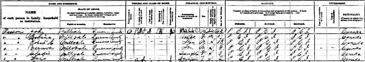 | Census | He was head of the household in the census in 1921 in Botsford, Westmorland County, New Brunswick, CanadaG. included in the household with Charles (age 30) were his wife Marie Blacklock (age 28), their children Doris (age 3) and twins Marjorie & Robert (age 1). Charles was a sales agent for the railway (C.N.R.). The family religion was Presbyterian.8 1921 Canada Census, Botsford, Westmorland County, New Brunswick. Household of Charles Oulton, his wife Marie Blacklock, their children Doris, Marjorie and Robert. |