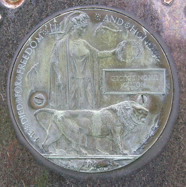 | Burial | He was buried in Vlamertinghe New Military Cemetery, Vlamertinge, Ypres, Belgium, 50.847775;2.819100G. his grave reference is IX.C.3. The modern spelling of the town is Vlamertinge. Inscription on family tombstone in Elmwood Cemetery, Moncton, New Brunswick, Canada: GIBSON / George E. Gibson / 1864-1946 / His Wife / Annie J. Magee / 1871-1964 / Bessie M., 1903-1905. Left Side: In / Memory of / Pte. George N. Gibson / 26th Batt. C.E.F. / Killed in Action / At Passchendaele / Nov. 6, 1917 / Aged 22 Years / Buried at / Vlamertinghe / New Military / Cemetery / Belgium. Right Side: Margaret D. Magee / 1863 / 1951.Rear: GIBSON.2,1 Tombstone, George Edward Gibson (1864-1946), his wife Annie Jane Magee (1871-1964), daughter Bessie (1903-1905), son George Noble (1894-1917), Margaret D. Magee (1863-1951. Elmwood Cemetery, Moncton, Westmorland County, New Brunswick, Canada.  Left inscription detail.  Right inscription detail.  World War I medal detail |