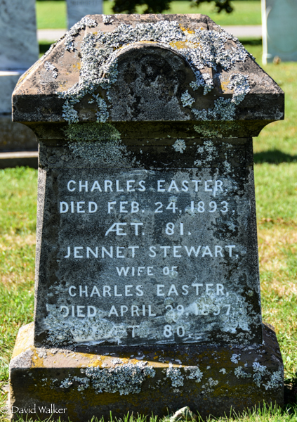 | Principal 2 | She witnessed the burial of Charles W. Easter and Janet Stewart in the People's Cemetery, Malpeque, Prince County, Prince Edward Island, Canada, 46.52961, -63.68759G.2,3 Tombstone, Charles Easter (1811-1893), his wife Jennet Stewart (1817-1897). Peoples Cemetery, Malpeque, Prince County, Prince Edward Island, Canada. |