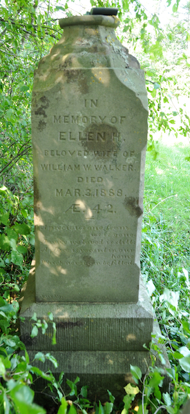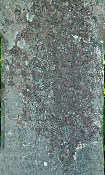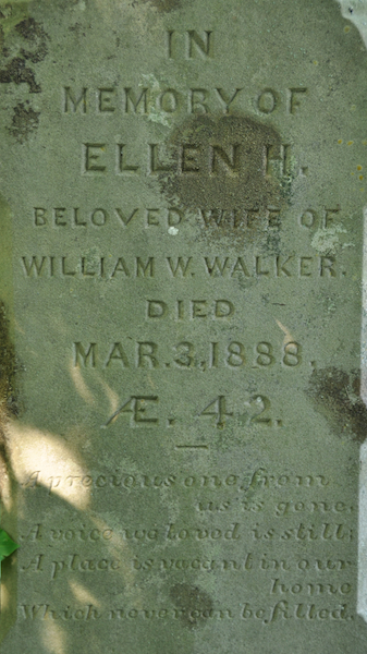 Inscription: In / Memory of / Ellen H. / Beloved Wife of / William W. Walker / Died / Mar. 3, 1888. / AEt. 42. / -/ A precious one from / us is gone. / A voice we loved is still; / A place is vaccint (sic) in our home / which never can be filled. Right: Ada Millicent / Died / Oct. 9, 1884 / AEt. 4. / Margaret G. / Died / Feb. 21, 1888 / AEt 4 D's. / Children of / William W. & Ellen H. / WALKER.1  Tombstone, Ellen H. Walker and her two daughters, Ada Millicent and Margaret. Old Dock Cemetery, Alberton, Prince County, Prince Edward Island, Canada.  Front inscription detail.  Right inscription detail.