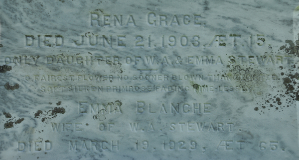 Inscription: Rena Grace / Died June 21, 1903, ÆT. 15. / Only daughter of W.A. & Emma Stewart / Emma Blanche / Wife of W.A. Stewart / Died March 19, 1929, ÆT. 65. / STEWARTLeft: William A. Stewart / Died / Oct. 1, 1932 / / ÆT. 65.Right: Colin H. Stewart / 1889 - 1965 / His Wife / Vera L. Baker / 1890 - 1968Back: Gladys Ruth Locke / Wife of / Donald Stewart / 1893 - 1953 / STEWART.1  Tombstone, Rena Grace Stewart (1888-1903), her parents Emma Blanche McPhail (1863-1929) and William A. Stewart (1865-1932), their son Colin H. Stewart (1889-1965), his wife Vera L. Baker (1890-1968), Gladys Ruth Locke (1893-1953), first wife of Donald Stewart, son of William Stewart & Emma Blanche McPhail.. Peoples Cemetery, Summerside, Prince County, Prince Edward Island, Canada.  Front inscription detail.  Left inscription detail.  Right inscription detail.  Back inscription detail.