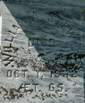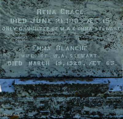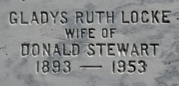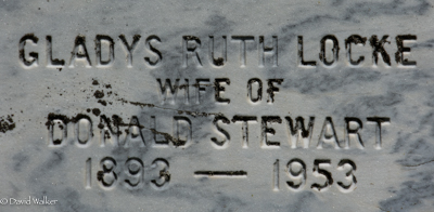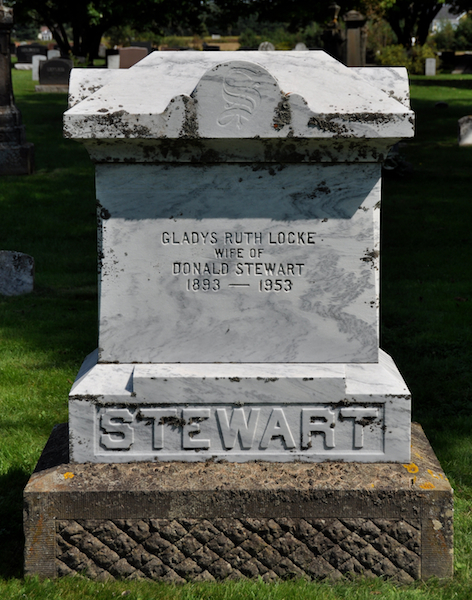 | Burial | She was buried in the Peoples Cemetery, Summerside, Prince County, Prince Edward Island, Canada, 46.40537, -63.77694G. Inscription: Gladys Ruth Locke / wife of / Donald Stewart / 1893-1953. Left: Colin H. Stewart / 1889-1965 / his wife / Vera L. Baker / 1890-1968. Right: William A. Stewart / died / Oct. 1, 1932 / AET. 65. Back: Rena Grace, / died June 21, 1903, AET. 15. / only daughter of W.A. & Emma Stewart / O fairest flower no sooner blown than blasted / soft silken primrose fading time-lessly / Emma Blanche / wife of W.A. Stewart / died March 19, 1929, AET. 65.1 Tombstone, Gladys Ruth Locke (1893-1953), Colin H. Stewart (1889-1965), brother of Donald O. Stewart, Colin's wife Vera L. Baker (1890-1968), William A. Stewart (1867-1932), father of Donald O. Stewart, Rena Grace Stewart (1893-1908), daughter of William & Emma Stewart, Emma Blanche McPhail (1864-1929), wife of William A. Stewart. The Peoples Cemetery, Summerside, Prince County, Prince Edward island, Canada.  Front inscription detail.  Left inscription detail.  Right inscription detail.  Back inscription detail. |