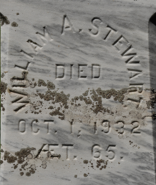 Inscription: Rena Grace / Died June 21, 1903, ÆT. 15. / Only daughter of W.A. & Emma Stewart / Emma Blanche / Wife of W.A. Stewart / Died March 19, 1929, ÆT. 65. / STEWARTLeft: William A. Stewart / Died / Oct. 1, 1932 / / ÆT. 65.Right: Colin H. Stewart / 1889 - 1965 / His Wife / Vera L. Baker / 1890 - 1968Back: Gladys Ruth Locke / Wife of / Donald Stewart / 1893 - 1953 / STEWART.2  Tombstone, Rena Grace Stewart (1888-1903), her parents Emma Blanche McPhail (1863-1929) and William A. Stewart (1865-1932), their son Colin H. Stewart (1889-1965), his wife Vera L. Baker (1890-1968), Gladys Ruth Locke (1893-1953), first wife of Donald Stewart, son of William Stewart & Emma Blanche McPhail.. Peoples Cemetery, Summerside, Prince County, Prince Edward Island, Canada.  Front inscription detail.  Left inscription detail.  Right inscription detail.  Back inscription detail.
