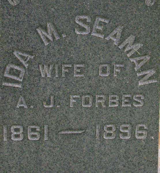 | Burial | She was buried on 4 January 1896 in Elmwood Cemetery, Moncton, Westmorland County, New Brunswick, Canada, 46.106200, -64.775033G. Inscription: Jacob Seaman / 1835-1915 / Mary A. Trites / His Wife / 1841-1928 / Children / John L. 1866-1870 / Pearl S. 1874-1875. / SEAMAN. Left Side: Blank. Right Side: Ida M. Seaman / Wife of / A.J. Forbes / 1861-1896. There is a set of flat stones in front of the main tombstone, from left to right, Ida - Pearl - Father - Mother - John.1,4 Tombstone, Jacob Seaman (1835-1915), his wife mary Ann Trites (1841-1928), children John (1866-1870), Pearl (1874-1875) and Ida (1861-1896). Elmwood Cemetery, Moncton, Westmorland County, New Brunswick, Canada.  Front inscription detail.  Right inscription detail. |