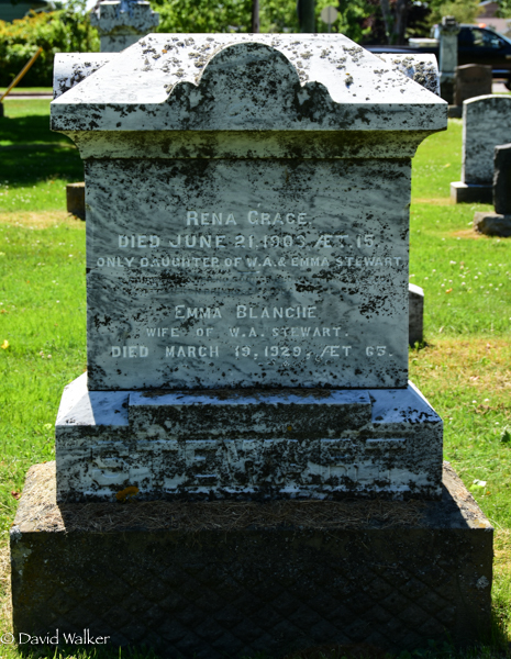 | Interred | She was buried in the plot of Rena Grace Stewart, in the Peoples Cemetery, Summerside, Prince County, Prince Edward Island, Canada, 46.40515, -63.77688G.