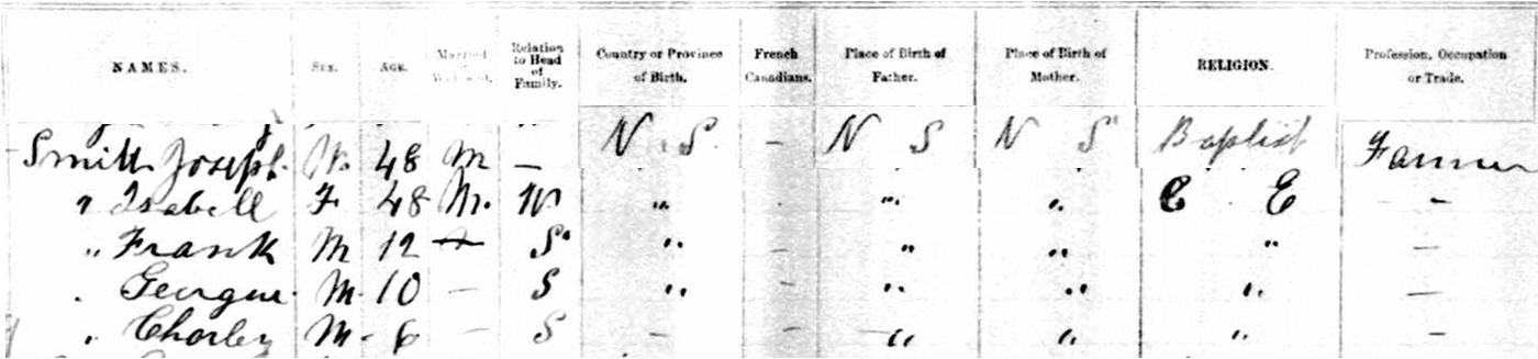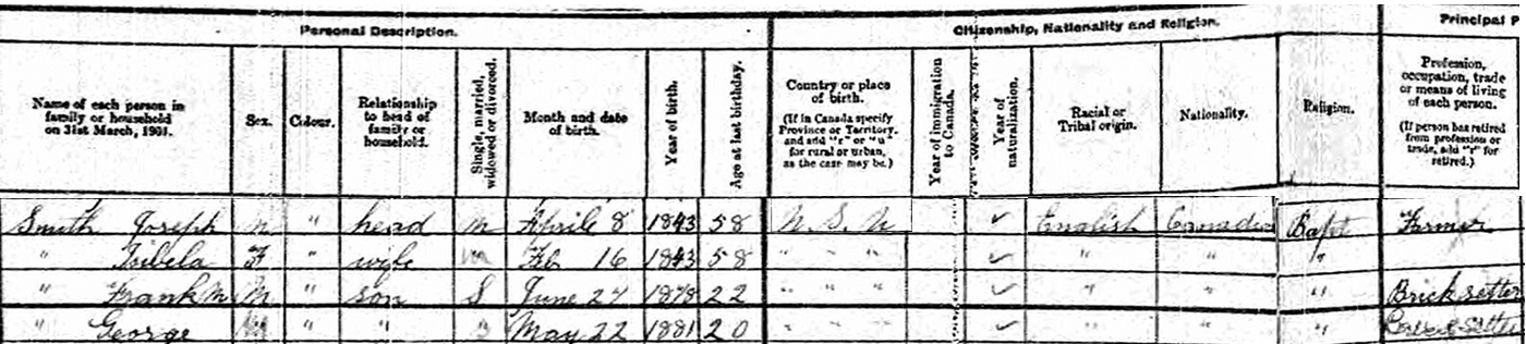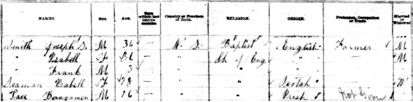 | Census | Joseph S. Smith was head of the household in the census in 1881 in Pugwash, Cumberland County, Nova Scotia, CanadaG. included in the household with Joseph (age 36) were his wife Isabell Seaman (age 36), their son Frank (age 3), Isabell's mother Isabella Campbell, and an apparently unrelated lodger, Benjamin Pace (age 16). Joseph was a farmer. He was Baptist while other family members were Church of England.5 1881 Canada Census, Pugwash, Cumberland County, Nova Scotia. Household of Joseph S. Smith, his wife Isabell Seaman, their son Frank, and Isabell's mother, Isabell Campbell. |