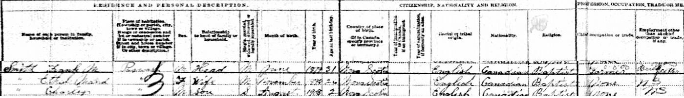 | Census | He was head of the household in the census on 2 June 1911 in Pugwash River, Cumberland County, Nova Scotia, CanadaG. included in the household with Frank (age 31) were his wife Ethel Maud (age 26) and their son Charlie (age 2). Frank was a farmer and brick fitter. The family religion was Baptist.5 1911 Canada Census, Pugwash, Cumberland County, Nova Scotia. Household of Frank M. Smith, his wife Ethel Maud, their son Charlie. |