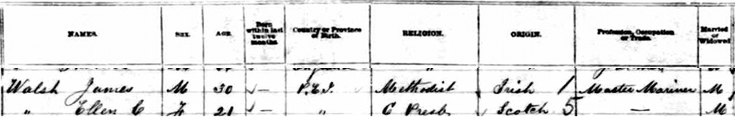 | Census | Capt. James H. Walsh was head of the household in the census in 1881 in Summerside, Prince County, Prince Edward Island, CanadaG. Enumerated in the household with James (30) was his wife Ellen Charlotte Clay (age 21). He was a Master Mariner. He was Methodist, she was Presbyterian.4 1881 Canada Census, Summerside, Prince Edward Island. Household of James H. Walsh and his wife Ellen Charlotte Clay. |
