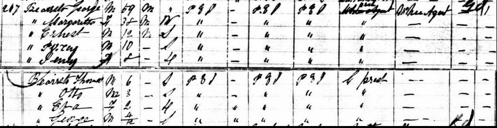 | Son | He was enumerated on the census on 21 May 1891 in the household of George Aitken Beairsto, as a son, in Charlottetown Royalty, Queens County, Prince Edward Island, CanadaG. Enumerated in the household of George Bearisto (age 59) were his second wife, Margaretta Binns (age 38), children by his first wife, Ernest (age 12), Percy (age 10) & Jessy (age 8), and children by his second marriage, Thomas (age 6), Otto (age 3), Eva (age 2) and George (age 4 months). The family religion was Presbyterian.1 1891 Canada Census, George Beairsto, second wife Margaretta and seven children. |