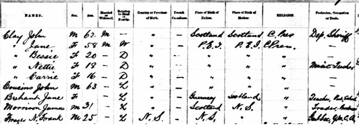 | Census | He was head of the household in the census in 1901 in Summerside, Prince County, Prince Edward Island, CanadaG. Enumerated in the household with James (age 50) were his wife Ellen (age 41), children Frank (age 18), Florence (age 16), Jennie (age 14), Harold, (age 13) and Grace (age 7). James was a Master Mariner, Frank a student. James was a Methodist, the rest of the family Presbyterian.2 |