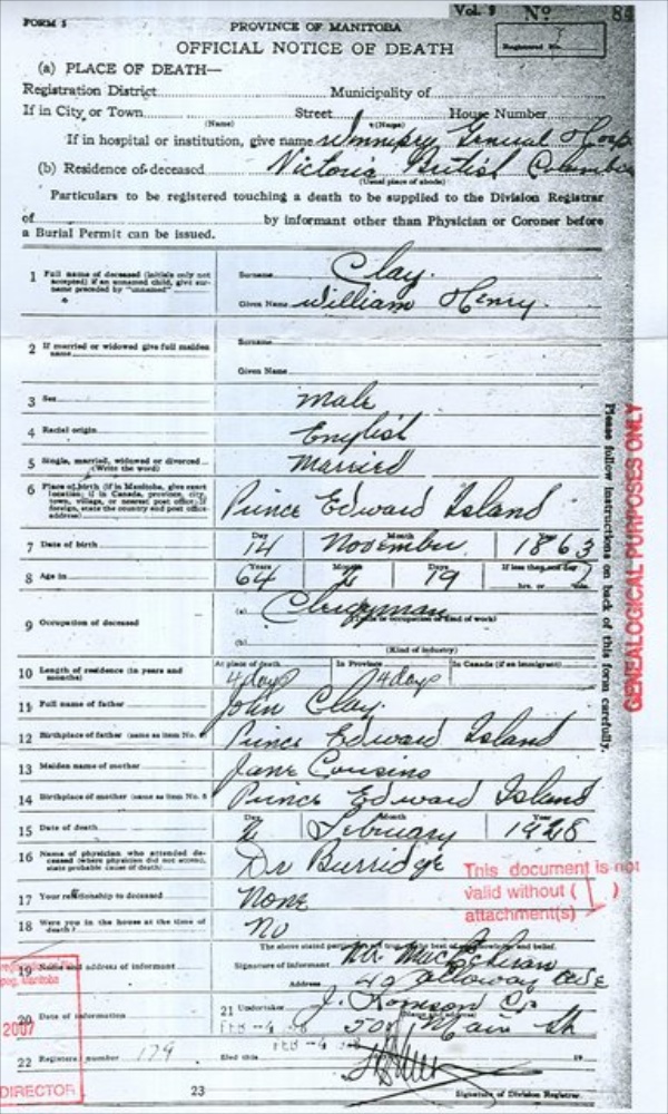 - [S4387] Death Registration - William Leslie Clay, Official Notice of Death #179, Personal Archives of David Arthur Walker, Personal Archives of David Arthur Walker, copy sent from Thomas Brown. Hereinafter cited as Death Registration - William Leslie Clay.