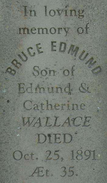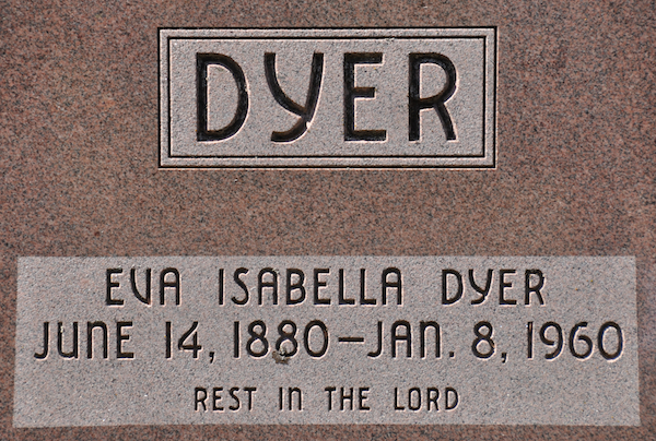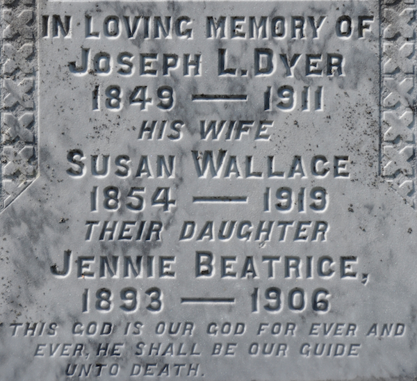 | Burial | She was buried in St. Peters Anglican Church Cemetery, Alberton, Prince County, Prince Edward Island, Canada, 46.81851, -64.06075G. Inscription: In Loving Memory Of / Joseph L. Dyer / 1849 - 1911 / His Wife / Susan Wallace / 1854 - 1919 / Their Daughter / Jennie Beatrice, / 1898 - 1906 / This God Is Our God And / Ever He Shall Be Our Guide / Unto Death. / DYER.1 Tombstone for Joseph L. Dyer (1849-1911) and Susan Wallace (1854-1919). St. Peters Anglican Cemetery, Alberton, Prince County, Prince Edward Island, Canada.  Front inscription detail. |