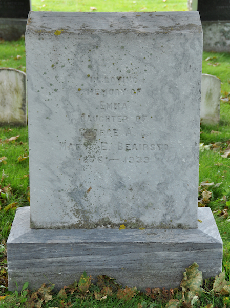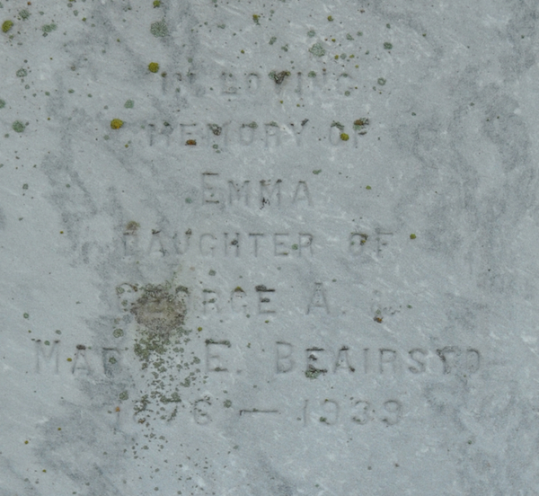 Inscription: BEAIRSTO / In Loving / memory of / Emma / Daughter of / George A. & / Mary E. Beairsto / 1876-1939.1  Tombstone, Emma Beairsto (1876-1939). Peoples Cemetery, Summerside, Prince County, Prince Edward Island, Canada.  Front inscription detail.