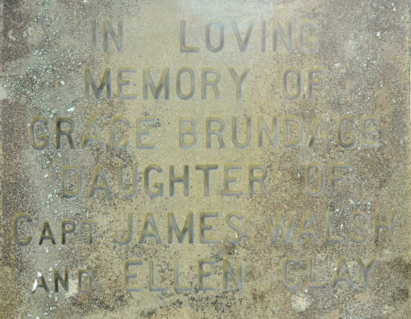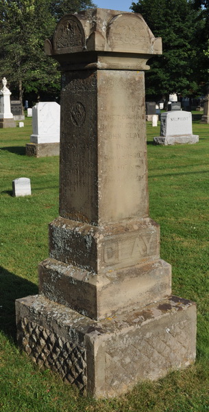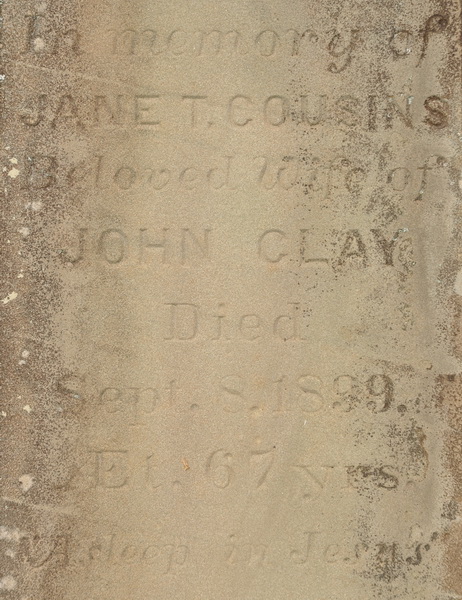 Square obelisk. Inscription: In memory of / Jane T. Cousins / Beloved wife of / John Clay / Died / Sept. 8, 1899. / AEt. 67 yrs. / Asleep in Jesus. Left: In memory of / John Clay / Died / Nov. 22, 1900. / AEt. 71 y'rs. / "Blessed Sleep". Right: In Loving / Memory of / Capt. James H. Walsh / Drowned / Dec. 13, 1919. / Aged 70 Years. / Also His Wife / Ellen / 1860 - 1927. Back: In Loving / Memory of / Grace Brundage / Daughter of / Capt. James Walsh / and Ellen Clay.1  Tombstone for John Clay ( (1829-1900) and Jane Townsend Cousins (1832-1899). Peoples Cemetery, Summerside, Prince County, Prince Edward Island, Canada.  Front inscription detail.  Left inscription detail.  Right inscription detail.  Back inscription detail.