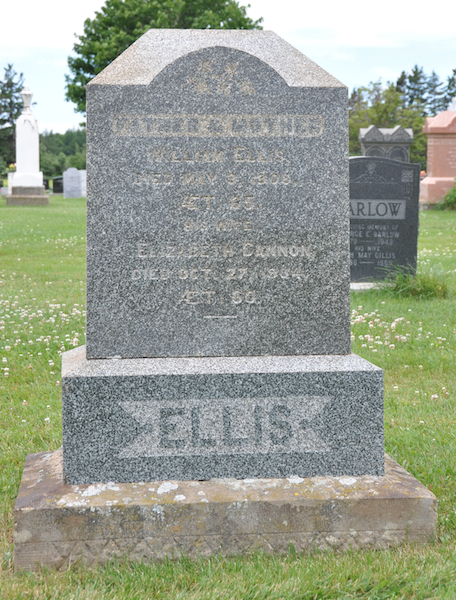 Inscription: Father & Mother / William Ellis / Died May 3, 1908 / AET. 65. / His Wife / Elizabeth Cannon / Died Oct. 27, 1904 / AET. 60 / ELLIS.1  Tombstone for William Ellis (1843-1908) and Elizabeth Cannon (1844-1904). United Church Cemetery, Bideford, Prince County, Prince Edward Island, Canada.  Inscription detail.