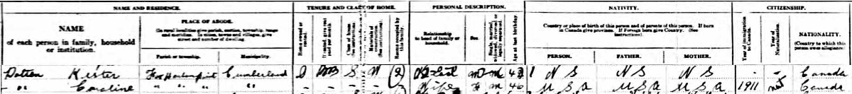 | Census | Nester Kent Dotten was head of the household in the census in 1921 in Fox Harbour Point, Six Mile Road, Cumberland County, Nova Scotia, CanadaG. included in the household with Nester (age 43) was his wife Caroline Marsh (age 46). Nester was a farmer. The family religion was Presbyterian.6 1921 Canada Census, Six Mile Road, Cumberland County, Nova Scotia. Household of Nester Dotten and his wife Caroline Marsh. Census image courtesy of Library & Archives Canada. |