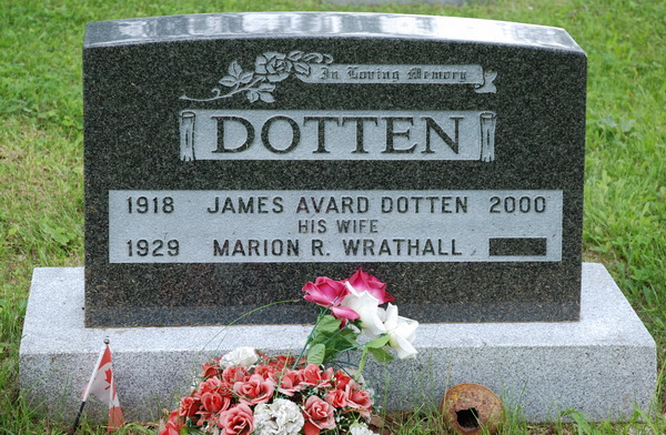 Inscription: In Loving Memory / DOTTEN / 1918 James Avard Dotten 2000 / His Wife / 1929 Marion R. Wrathall -.1,2  Tombstone, James Avard Dotten (1918-2000) and his wife Marion Ruth Wrathall (1929-). Dotten Burial Ground, North Wallace, Cumberland County, Nova Scotia, Canada.