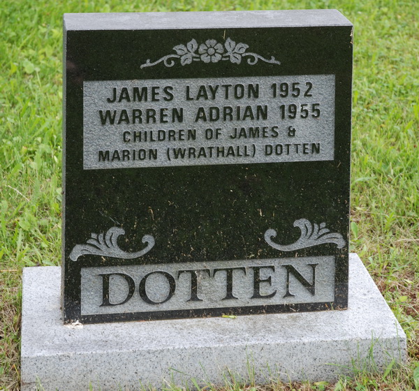 | Burial | He was buried in Dotten Burial Ground, North Wallace, Cumberland County, Nova Scotia, CanadaG. Inscription: James Layton 1952 / Warren Adrian 1955 / Children of James & / Marion (Wrathall) Dotten / DOTTEN.1,2 Tombstone, James Layton Dotten (1952-1952) and Warren Adrian Dotten (1955-1955), children of James A. Dotten and Marion R. Wrathall. Dotten Burial Ground, North Wallace, Cumberland County, Nova Scotia, Canada. |