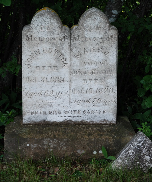 | Burial | She was buried in Dotten Burial Ground, North Wallace, Cumberland County, Nova Scotia, CanadaG. Inscription: In / Memory of / John Dotton / Died / Oct. 31, 1891 / Aged 69 yr's / - | In / Memory of / Mary J. / Wife of / John Dotton / Died / Oct. 10, 1890. / Aged 70 yrs. / - / Both Died With Cancer.1,2 Tombstone, John Dotten (1822-1891), and his wife Mary Jane Hannah (1838-1890). Broken footstone leaning against base, J.D. / M.J.O. Dotten Burial Ground, North Wallace, Cumberland County, Nova Scotia, Canada. |